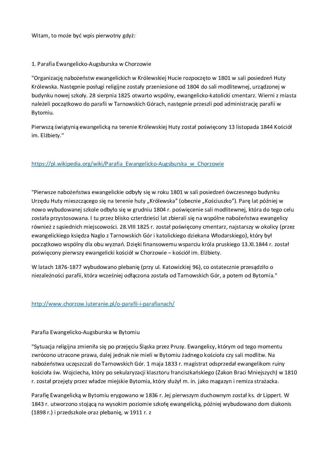 „Obecnie funkcjonująca parafia w tym mieście jest najstarszą na Górnym Śląsku, gdyż powstała jako pierwsza z górnośląskich parafii luterańskich po roku 1742 , gdy pruskim zarządzeniem królewskim zezwolono na ponowne zakładanie kościołówewangelickich.