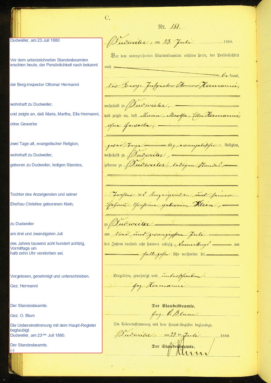 „W oparciu o zezwolenie urzędu nadzorczergo dokonano nowego wpisu, w miejsce niewłaściwego wpisu numer 12, w wykazie zmarłych z roku 1926“. Zgłaszająca jest osobą znaną, a o tym przypadku śmiertelnym wie z własnej wiedzy.Przeczytano na głos, uznano i podpisano