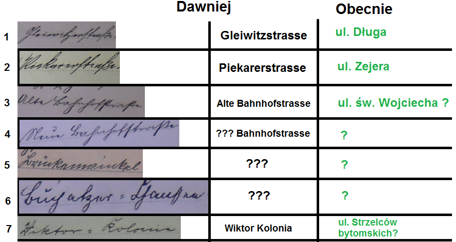 UżytkownikProszę o pomoc w poprawnym uzupełnieniu poniższej tabelki dotyczącej radzionkowskich ulic. W pierwszej kolumnie znajduje się fragment dokumentu zawierający nazwę ulicy, w drugiej jest zapisana ulica po niemiecku (odczytane z kolumny 1), a w 3 znajduje się aktualna nazwa ulicy.